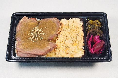 柔らかい牛ハラミステーキと鮭のほぐし身の2色ステーキ重。